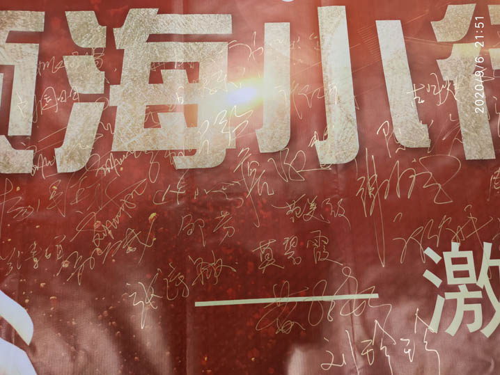 下圖:是上圖簽到背景墻燈布,拆下來的拍相片效果近距離的給客戶看,我們所做的這種油漆筆簽名的效果。金色油漆筆不易退色,效果醒目。