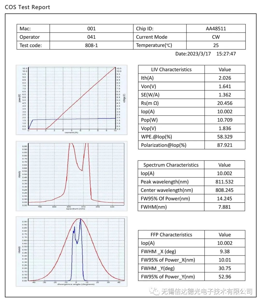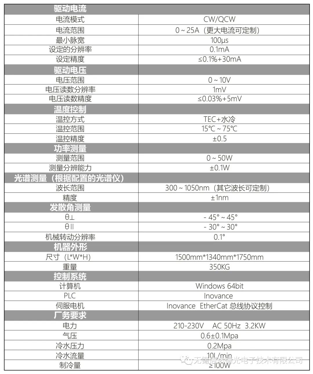 。主要針對封裝之后的COS半導體激光器芯片器件,在可控溫度工作臺上自動測定其光功率、電壓、電流、波長、遠場發(fā)散角、偏振等特性,能夠表示結果產(chǎn)品特點: