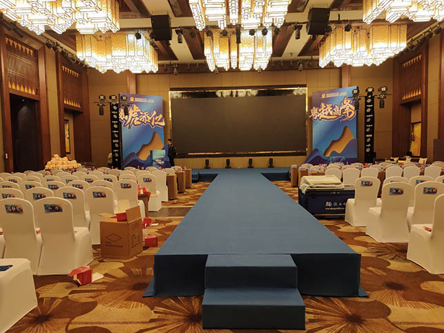 1、下圖活動項目:在清遠市的瞻云酒店,負一樓的宴會廳,但負一樓的宴會廳外面可以看到一個湖。舞臺加寬1*12米,舞臺前板2*12米;用藍色地毯,搭建舞臺是送臺階的,一般來說舞臺搭建同行價格一平方55元左右,而企業(yè)客戶是65-70元左右一平方,包地毯價格在內(nèi)。